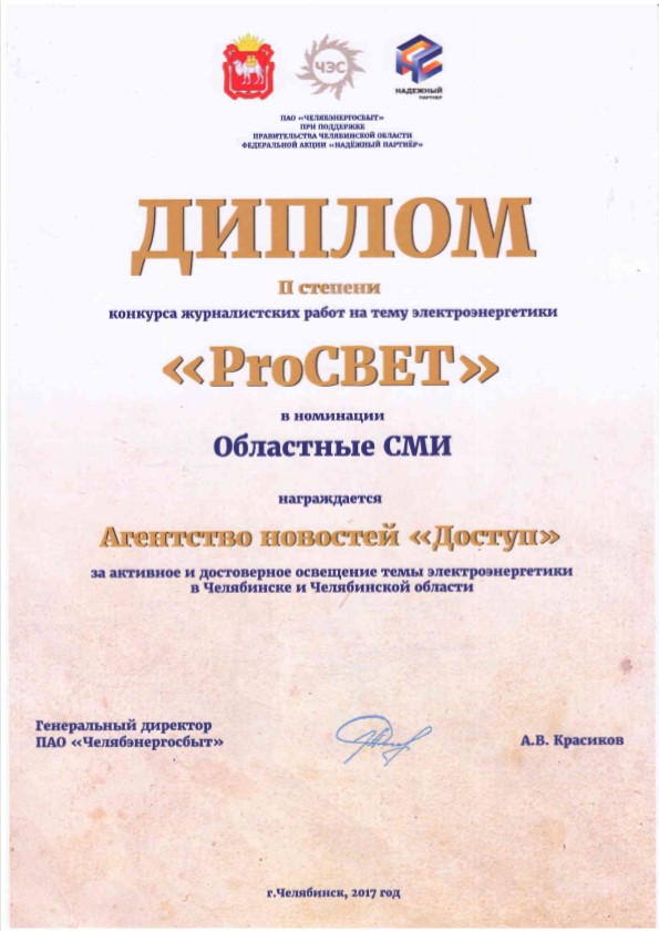 Агентство новостей «Доступ» – это профессиональный источник новостей с 2008 года, оперативной информации о Челябинске и Челябинской области. Наш профиль – объективное отражение актуальной картины дня, поэтому АН «Доступ» в режиме онлайн распространяет в сети интернет и по каналам электронной связи общественно-политическую, экономическую, финансовую информацию, а также ежедневные анонсы предстоящих событий политической, экономической и культурной жизни Челябинска и Челябинской области.