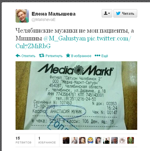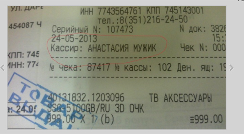 Общественный подъем и внутреннее веселье вызвал всплеск перепостов у пользователей соцсетей одной и той же фотографии чека. Челябинцы после похода в магазин техники обращали пристальное внимание на чек, на котором были зафиксированы имя и фамилия кассира – Анастасия Мужик.
