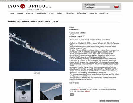 Во вторник, 20 августа, осколок метеорита Челябинск весом 27,1 грамма был продан на аукционе в Шотландии за 700 фунтов стерлингов (около 36 тыс. рублей. – Прим. АН «Доступ»). Его выставил на продажу известный охотник за метеоритами Роберт Эллиотт в рамках своей третьей коллекции. Журналистам британской газеты и порталу коллекционер признался, что добыл свой лот № 44 контрабандным путем, за что удостоился звания местного Индианы Джонс.