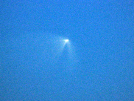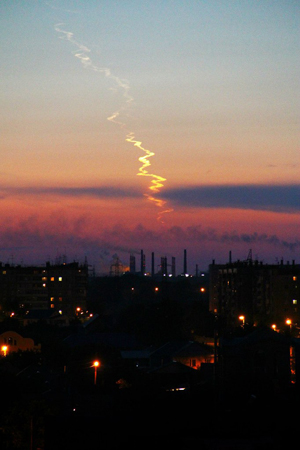 В 23.32 она появилась над Челябинском. Сначала в небе засветилась маленькая белая точка с ореолом позади, затем от нее отделилась такая же, и на небольшом расстоянии друг от друга они продолжили свой путь, оставив после себя инверсионный след. Аналогичная картина была в ряде городов Южного Урала, в том числе Кыштыме, Миассе, Троицке, Магнитогорске и других.