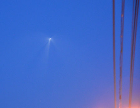 Прогноз ученых о появлении по траектории полета пущенной с Байконура ракеты серебристых облаков подтвердился. После того как «Союз-2.1б» пересекла воздушной пространство над Челябинском и отбросила первую ступень, небо вновь озарилось сиянием.