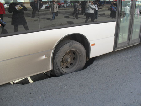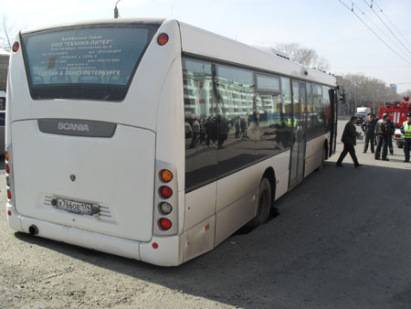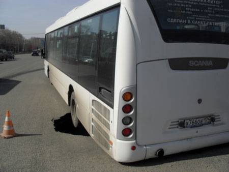 «Рейсовый автобус сегодня, 9 апреля, около 13.15 двигался по маршруту № 4 в сторону площади Революции и провалился, когда подъехал к остановке "Комсомольская площадь". На момент происшествия в нем находилось 32 пассажира», – рассказал Агентству водитель.