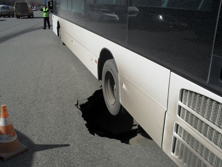 В южноуральской столице рейсовый автобус SCANIA просел под асфальт в районе Комсомольской площади – дорогу пять месяцев назад восстановили в рамках строительства метро, передает корреспондент Агентства новостей «Доступ».