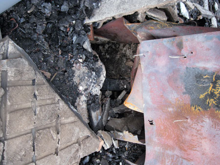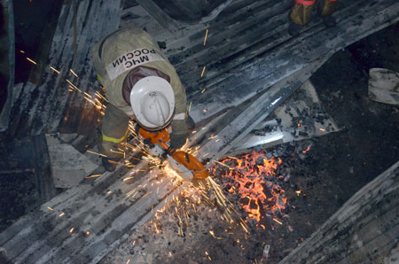 Специальным оборудованием пришлось разрезать балки, перегородки и железные листы, так как под подшивкой огонь уже превратил деревянные крепления в угли.