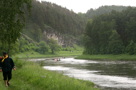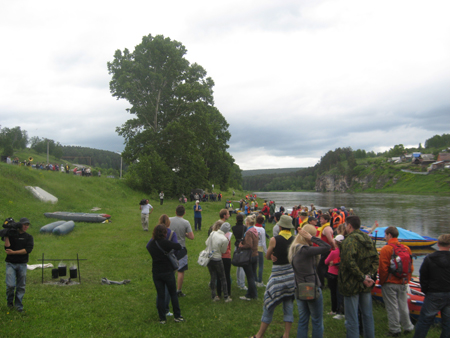 Следующая остановка – берег реки Ай, Блиновский поворот. Нас встречают бодрый оркестр, полтора десятка надувных катамаранов и в меру серьезные инструкторы. Последним с трудом удается собрать будущих участников сплава в неровный строй, провести с ними краткий инструктаж, а также выдать им в дорогу ленточки с патриотичным триколором – в честь Дня России – и тряпичный узелок с краюшкой ржаного хлеба. По одному на «борт».