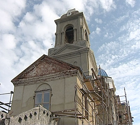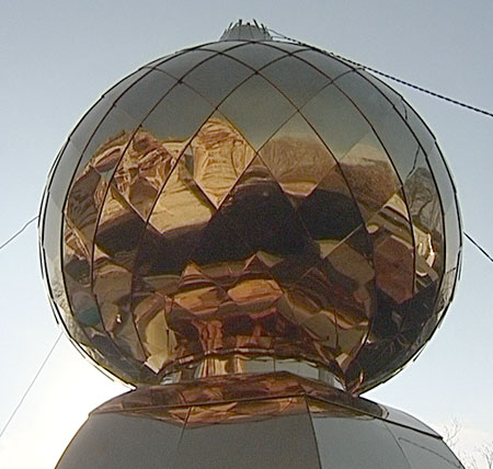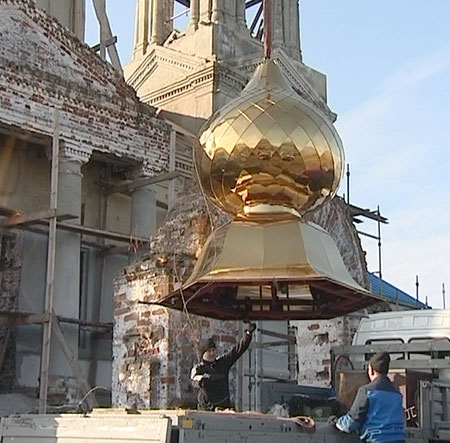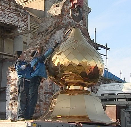 Как оказалось, установить купол на храме – задача не из легких. Сделанный в Трехгорном 500-килограмовый святой груз из нитрита титана поднимали автокраном.