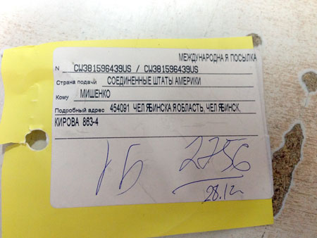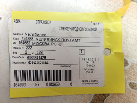 «В первый рабочий день, 9 января 2013 года, спустя почти месяц после отправки, мы с родственниками вместе пошли на почту. Посылку несколько минут искали, а потом вынесли плотный матерчатый мешок белого цвета с оранжевой пломбой на нем. К слову, на оранжевом ярлыке адрес был проставлен Кирова 863-4, вместо Кирова 86-4, хотя и на самой коробке, и на стикере адреса, и в декларации я четко указывал все печатными буквами и цифрами. То ли работники сортировки опечатались, то ли специально изменили адрес на не существующий, дабы усложнить нахождение и отсрочить получение посылки», – рассказал Андрей Борзыкин.