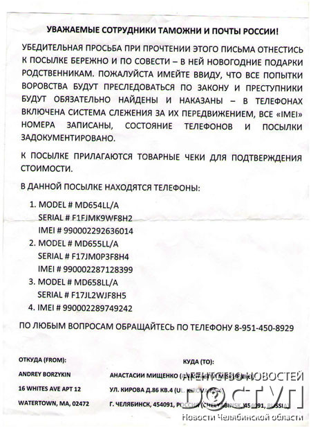 Гражданин РФ Андрей Борзыкин семь лет назад переехал на ПМЖ в Бостон (США). Периодически он посылает родным и друзьям в Челябинск заокеанские подарки. По традиции пошел на американскую почту и перед Новым годом – 11 декабря 2012 года отправил из Америки на родину три новых смартфона Apple iPhone5, надеясь, что гаджеты последней модели дойдут вовремя – аккурат к 31 декабря: посылки идут от двух до четырех недель.