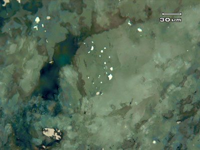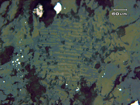 содержащий капли самородного железа (белые, яркие) и троилит (розовый внизу)