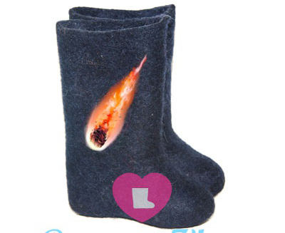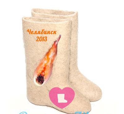 Уже утром 16 февраля в интернете появилось уникальное предложение от челябинских валяльщиков – астероидные валенки. В них умельцы предлагали южноуральцам отправиться на поиски осколков метеорита. «Мы, будучи непосредственными очевидцами падения метеорита, дабы запечатлеть это уникальнейшее атмосферное явление, создали астероидные валенки для женщин, в которых можно пуститься на поиски осколков, разлетевшихся по всей территории Челябинской области», – прокомментировали создатели эксклюзивной зимней обуви.