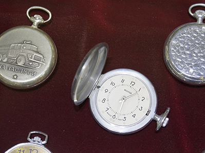 Насмотревшись на диковинный дизайн заграничных брендов, посетители ищут родные сердцу челябинские ходики разного времени выпуска. Но вместо ожидаемого «путешествия в прошлое» видят нечто совсем неожиданное. Например, часы для слепых: без стекла и секундной стрелки, с пупырышкам на циферблате. Или часы, стрелки которых двигаются справа налево. Оказывается, такие на часовом заводе «Молния» выпускались в двух вариантах – настенно-настольные и карманные. И эти образцы – совсем не шутки со временем, а вполне точный механизм, часовые индексы которого, как и стрелки, расположены в обратном порядке.