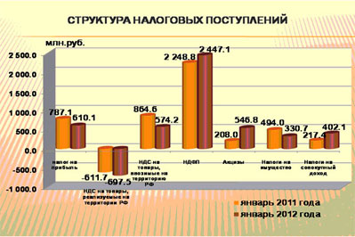 Следующую позицию по объему поступлений занимает налог на прибыль, которым обеспечено 610,1 млн. рублей налоговых платежей, что на 177 млн. рублей ниже предшествующего года (77,5% к январю 2011 года). Это обусловлено проведением в текущем году возвратов.