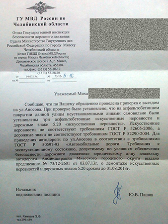 По его словам, Общественному совету Миасса удалось добиться от начальника городского отдела ГИБДД предписания о ликвидации нелегальных «лежачих полицейских» и дорожных знаков до 1 августа 2013 года. Однако на сегодняшний день ситуация по-прежнему остается без изменений: и неровности, и знаки на месте. Тем временем в адрес автора обращения в Госавтоинспекцию уже начали поступать угрозы, видимо, от жителей, имеющих отношение к установке «лжеполицейских».