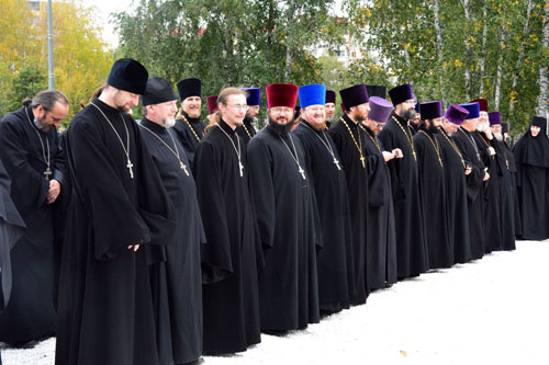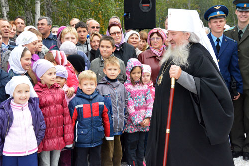 Ближе к началу церемонии приехал митрополит Челябинский и Златоустовский Феофан. Владыка поздоровался со всеми собравшимися, послушал музыкальное приветствие воспитанников православной гимназии и сделал замечание заигравшемуся с камешками мальчику.