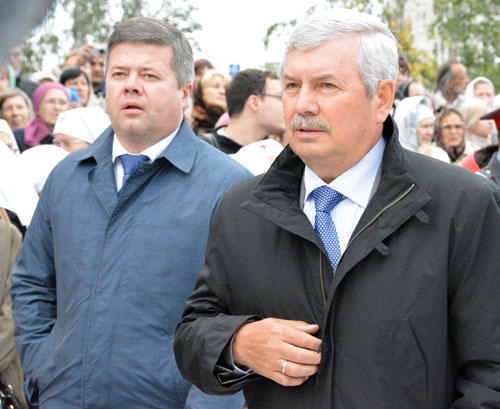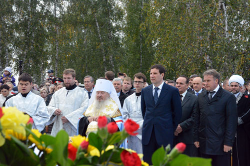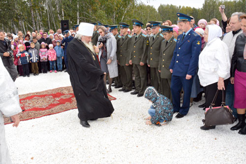 Церемония закладки первого камня не начиналась до прибытия губернатора Челябинской области Михаила Юревича, который вместе с владыкой Феофаном отстоял службу и выслушал все благословения нового храма.
