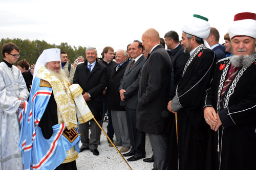 Чуть позже к первым лицам города присоединились собратья-мусульмане. Муфтий Ринат Раев приветствовал митрополита Феофана и выразил радость по поводу начала возведения собора.