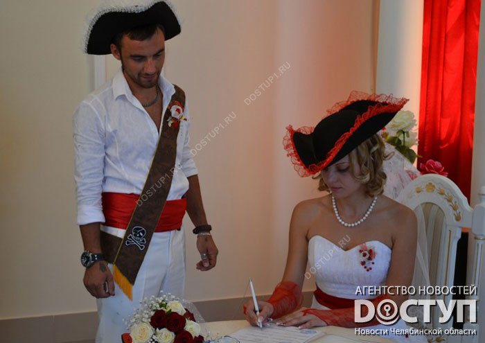 Необычную свадьбу сыграли в Коркинском отделе ЗАГС. Молодожены Елена Моисеенко и Антон Волков привлекали внимание прохожих и вызывали улыбки сотрудников госучреждения пиратскими одеяниями. Жених с невестой вошли в зал регистрации в треуголках и кушаках, соответствующе были одеты и гости, включая детей. Близкие молодоженов рассказали, что и само торжество будет проходить на сказочном «корабле».