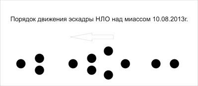 По словам миассца Константина Филиппова, поздним вечером (23.07 по местному времени) в субботу, 10 августа, он наблюдал 11 объектов, которые выстроились в геометрическую фигуру – ромб.