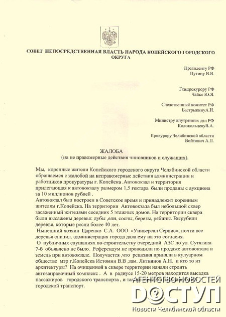 По ее словам, заправку решили строить именно на этом месте, так как других пустырей в городе уже не осталось. «Мы уже собрали подписи и отправили заявления в прокуратуру, Ростехнадзор, отдел по экологии администрации Копейска, ходили к депутатам, писали губернатору Челябинской области, а недавно написали президенту Путину. Но от местных чиновников нам пришли только отписки, от остальных – тишина», – продолжает Тамара Петроченко.