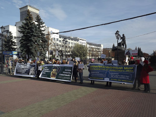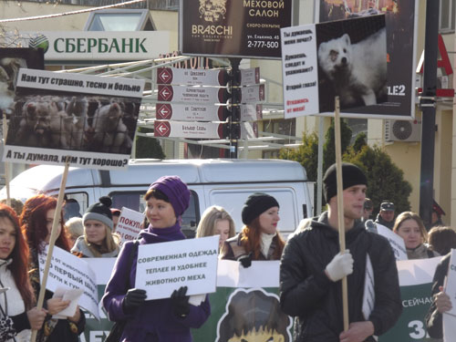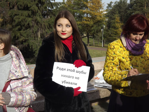 В ходе шествия участники устроили митинг возле памятника танкистам-добровольцам напротив известного мехового салона. «Покупая шубу, вы оплачиваете массовое убийство», «Современная одежда теплее и удобнее животного меха», – гласили лозунги на транспарантах. Впрочем, не все прохожие однозначно восприняли шумное действо. Так, несколько девушек в меховых полушубках обошли пикетирующих стороной. «Обольют еще какой-нибудь краской», – испугались они.