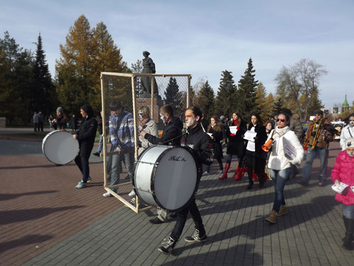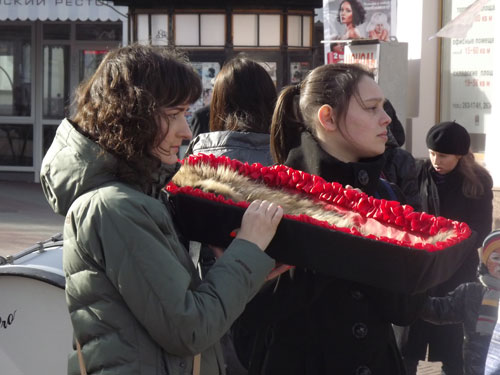 Колонну возглавила девушка с анималистическим гримом и в клетке, символизирующая обреченное на убой пушное животное. За ней в небольшом гробу несли воротник из «шкуристого» зверька.