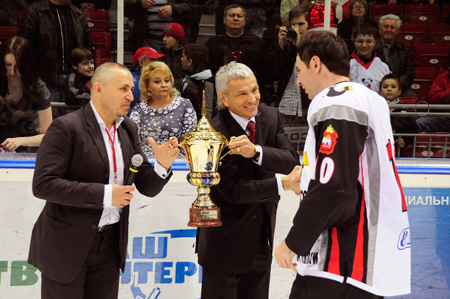 А за 20 секунд до конца третьего периода с паса Юревича Кречин поставил точку в этом матче: 7:4, побеждает «Команда губернатора» и выигрывает «Кубок космонавтики».