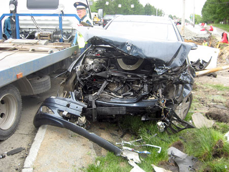 От удара Mercedes S 500 с буквами «ООО» несколько раз развернулся вокруг своей оси, авто отбросило на придорожный столб, где он едва не упал в яму, где рабочие меняют трубы.