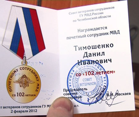 К десяткам наград, благодарностей, почетных грамот и медалей в день 102-летия у милиционера-долгожителя добавился орден «За заслуги» – высшая награда российского Совета ветеранов.
