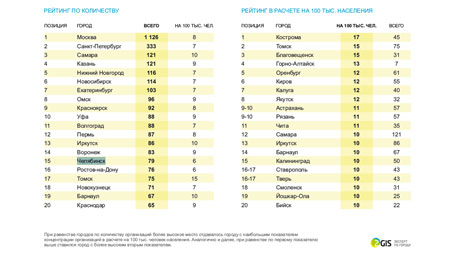 Авторы исследования сравнил города по количеству различных организаций, связанных с областью образования. Лидерами по большинству образовательных показателей признаны Москва и Санкт-Петербург. Челябинск занял 15 место по количеству вузов, 10-е – по ссузам и 12-е – по школам.