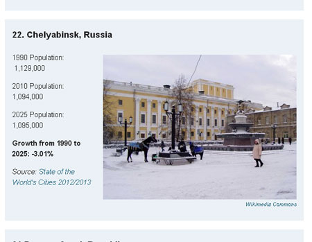 Челябинск вошел в ТОП-28 под номером 22. Согласно анализу статистических данных, с 1990 по 2025 год население южноуральской столицы сократится на 3,01%. Так, если в 1990 году в Челябинске жили 1 млн. 129 тыс. человек, то через 20 лет горожан стало 1 млн. 94 тыс. К 2025 году ООН прогнозирует в областном центре 1 млн. 95 тыс. человек.