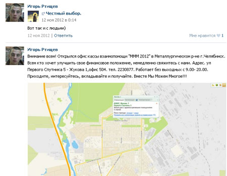 После смерти Игоря страницу в соцсети продолжает вести его мать, но до того как женщина взялась за это дело, видно, что парень проявлял живой интерес к МММ-2012 и даже приглашал людей к участию в пирамиде.