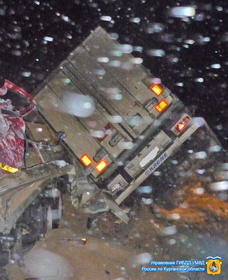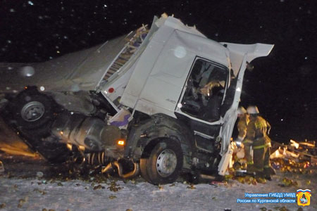 Происшествие случилось около часа ночи в пятницу, 8 марта, в Щучанском районе. По данным местной ГИБДД, 36-летний водитель грузовика Volvo по неустановленным причинам выехал на встречную полосу и столкнулся с МАЗ, за рулем которого был 32-летний мужчина.