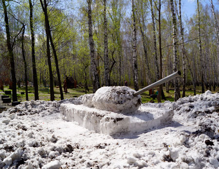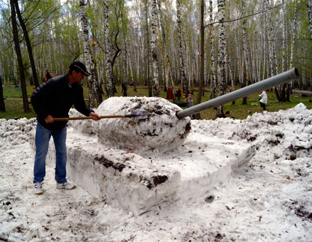 Автор снежного танка, краевед Александр Шестаков задумал свой Т-34 еще зимой, когда в парке красовалась самая большая армия снеговиков в России (более 200 в одном месте). После «мартовского побоища» челябинец не дал снегу растаять, укрыв его кучей соломы и грязи, а на днях снова откопал и за полтора часа построил боевую машину. В работе ему помогли лишь лопаты и обычная пластиковая труба, ставшая дулом.