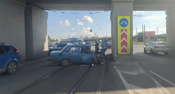 После удара отечественный автомобиль совершил наезд на бетонное ограждение – в мостовую опору. Водителю потребовалась медицинская помощь. Движение трамваев пришлось остановить почти на час.