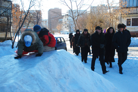В следующем дворе коробка оказалась залита льдом, как положено. На радостях ни сити-менеджер, ни его сопровождающие не стали обращать внимание на антицеллюлитную детскую горку, поверхность которой выравнивали чем-то типа граблей.