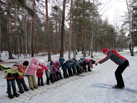 Зимой ребята обязательно бегают на лыжах – благо лес под боком, в пяти минутах от садика. Занимаются без палок – так лучше укрепляется мышечный корсет, что для будущих первоклассников очень важно.