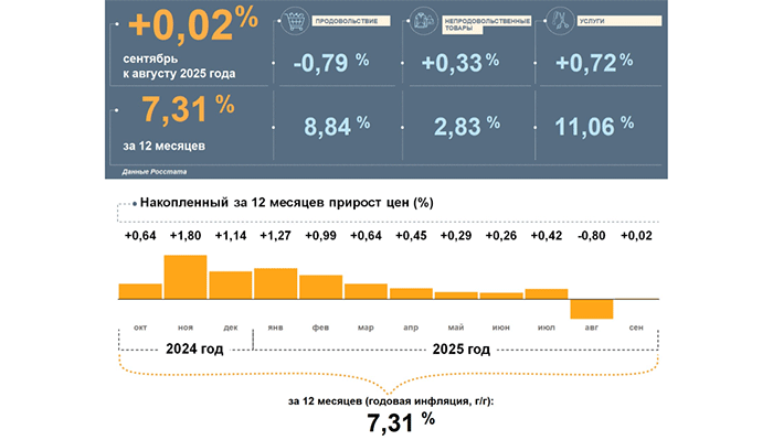Продовольствие в сентябре подешевело, тогда как накопленный за 12 месяцев рост цен на него оставался заметным.