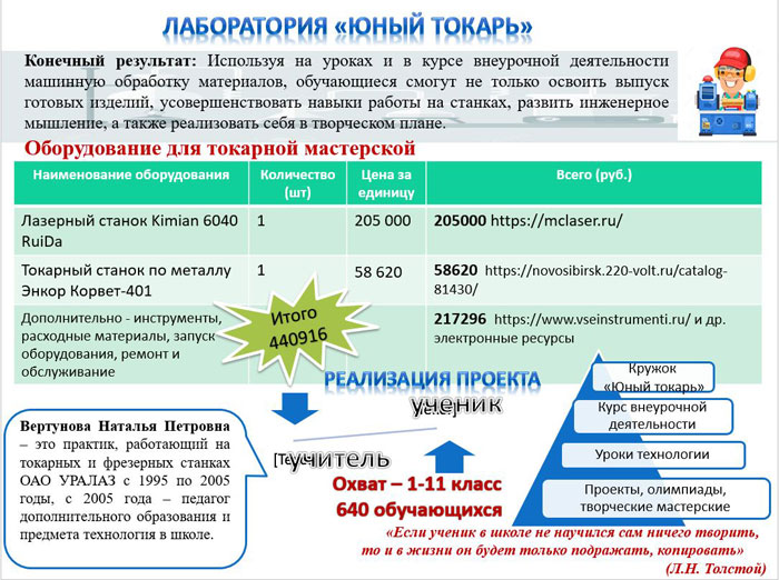 «В адрес управления поступило более 20 заявок на участие. Образовательные организации Миасского городского округа проработали идеи по оснащению мастерских и лабораторий оборудованием по предметам естественнонаучной направленности: физике, химии, технологии, информатике и т.д. Лидеры конкурсного отбора предлагали в качестве целевой аудитории широкий охват несовершеннолетних детей за счет, прежде всего, их заинтересованности в занятиях» – рассказала заместитель начальника Управления образования МГО Дарья Миронова.