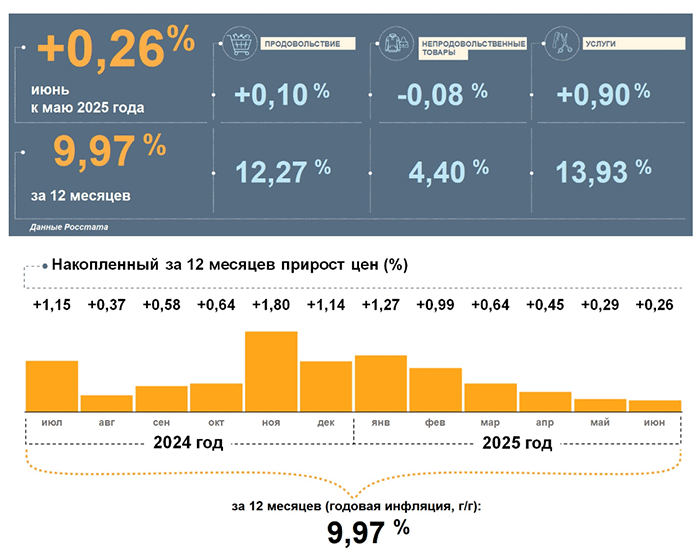Цены в прошлом месяце, по данным Росстата, выросли на 0,26% к маю. Годовая инфляция снизилась и составила 9,97%., но это выше, чем в целом по стране – 9,40%.