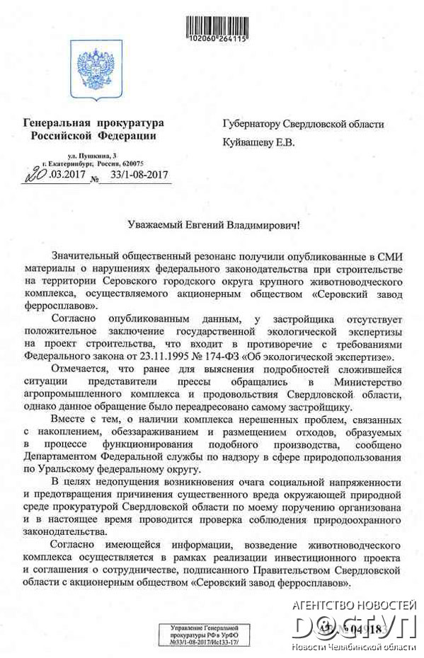 Кроме того, губернатору Свердловской области Евгению Куйвашеву направлено обращение, где обозначены проблемы строительства животноводческого комплекса в Серове, а также указано на необходимость их разрешения. В частности, в письме говорится, что у АО «Серовский завод ферросплавов» нет положительного заключения государственной экологической экспертизы на проект строительства.