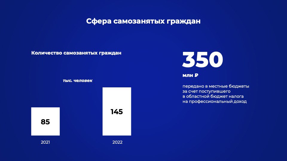 «Эти предприниматели теперь получают законный доход и наполняют местные бюджеты. Напомню, что у нас в регионе действует уникальная практика передачи налога на самозанятых в муниципалитеты. И для них этот налог становится важным доходным источником. Начинали в 2021 году с 85 миллионов, в прошлом – передали в муниципалитеты уже 350 миллионов, а в этом году, обращаю, коллеги, внимание, превысим полмиллиарда. В других субъектах Федерации эти средства поступают и остаются в региональных бюджетах», – подчеркнул Алексей Текслер.