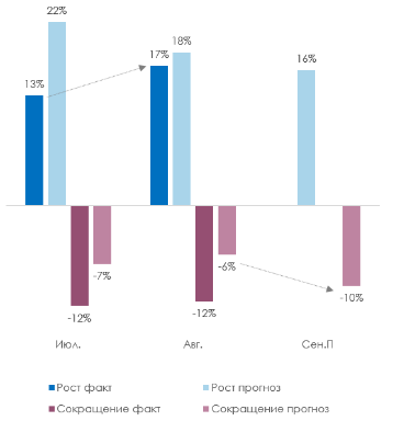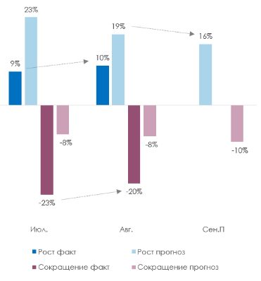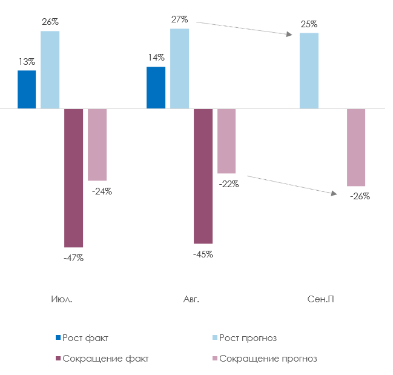 Фактическая инвестактивность вернулась к уровням июня, но остается невысокой: 17% компаний (+4 п.п.) наращивали объемы инвестиций, а 12%, напротив, — сокращали.