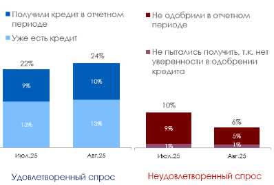 Отказ в кредитовании получили только 5% МСП, что почти вдвое меньше, чем месяцем ранее. При этом растет и уровень одобрения — новый кредит получили 10% компаний (+1 п.п.). В итоге доля одобрений среди подавших заявку на кредит выросла с 51% до 68% по итогам августа, максимальный рост за последние 9 месяцев.