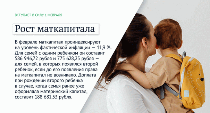 «Материнский капитал будет проиндексирован на 11,9% и составит 587 тыс. рублей на первого ребенка и 775,6 тыс. рублей на второго. Помощь семьям, создание всех условий для развития и воспитания детей – приоритет государственной политики России», – заявил председатель Госдумы Вячеслав Володин, комментируя законы, которые вступают в силу с 1 февраля.