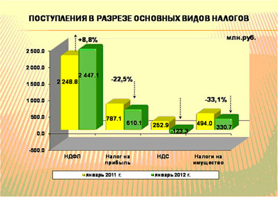 Следующую позицию по объему поступлений занимает налог на прибыль, которым обеспечено 610,1 млн. рублей налоговых платежей, что на 177 млн. рублей ниже предшествующего года (77,5% к январю 2011 года). Это обусловлено проведением в текущем году возвратов.