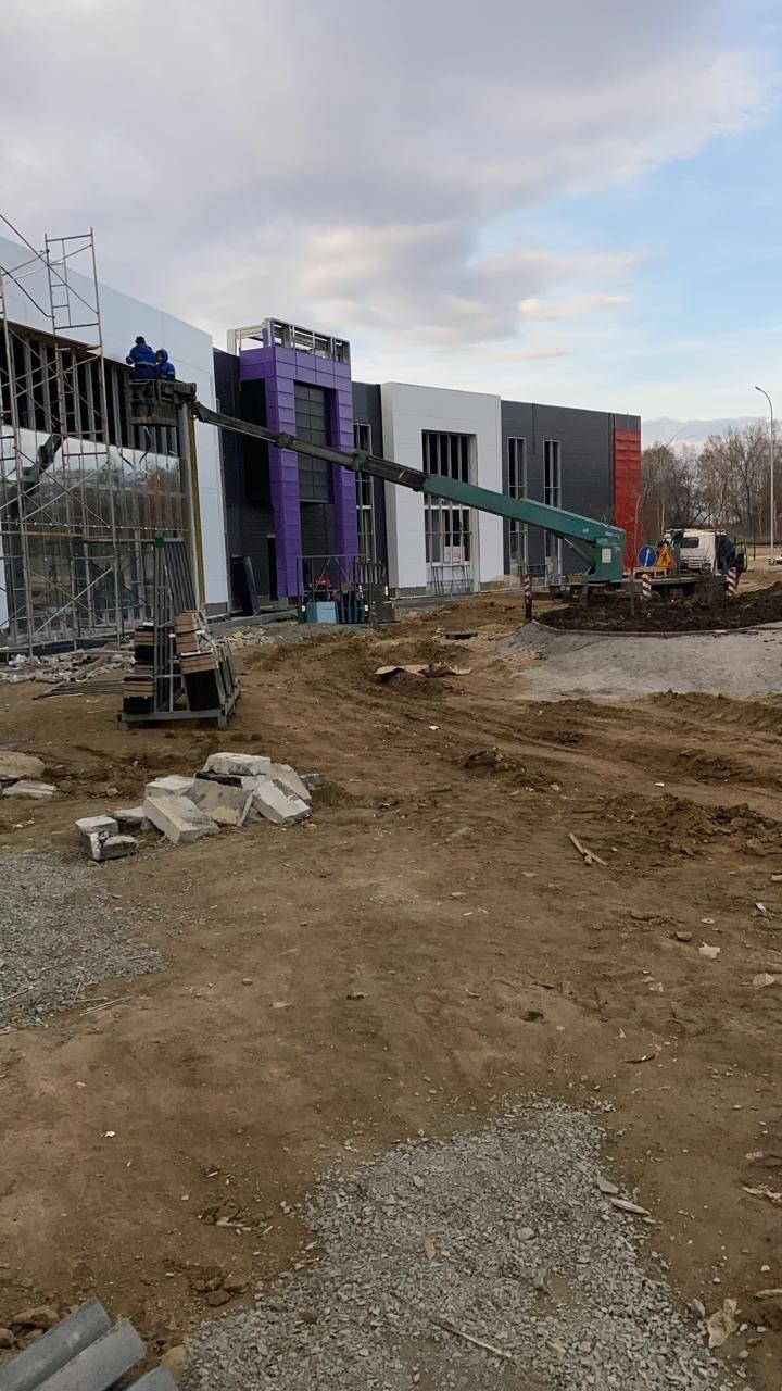 Также начато внешнее благоустройство: укладывается асфальт на центральных проездах, высаживаются крупномерные деревья на центральной части комплекса.