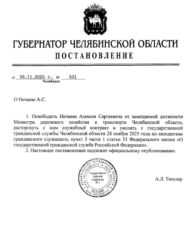 «Освободить Нечаева Алексея Сергеевича от замещаемой должности министра дорожного хозяйства и транспорта Челябинской области», – говорится в постановлении от 26 ноября.