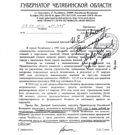 И наконец, в письме с просьбой рассмотреть возможность выделения в 2010 году 2 млрд. рублей на продолжение строительства метрополитена в Челябинске, президент России выделил сумму и отписал министру транспорта Игорю Левитину: «Рассмотрите».