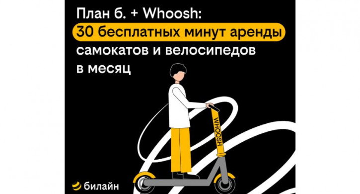 Билайн и сервис аренды самокатов Whoosh объявляют о запуске партнёрского проекта, в рамках которого пользователи тарифа «план б.» будут ежемесячно получать 30 бесплатных минут на аренду самокатов и велосипедов Whoosh. Предложение доступно всем абонентам тарифа до конца сентября, при этом воспользоваться бесплатными минутами можно в течение 30 дней с даты активации пакета.