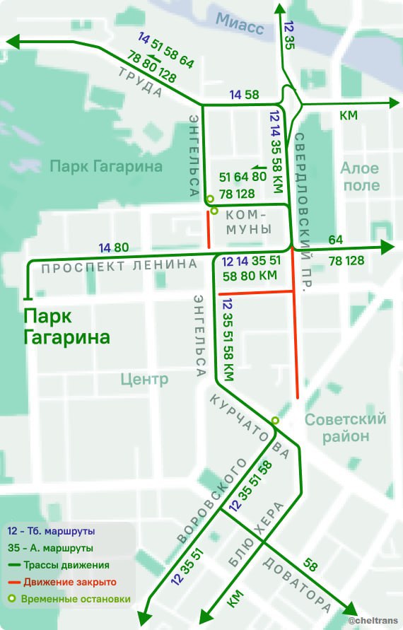 Автобусы № 35, 51, 58, 64, 78, 80, 128, КМ и троллейбусы № 12, 14 направят в объезд по проспекту Ленина, Свердловскому проспекту, улицам Коммуны и Труда.